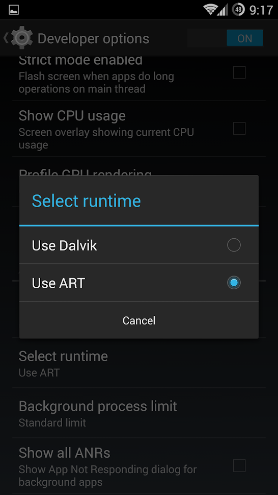 With developer option turned on, you can change the runtime from Dalvik to ART, which is supposed to be faster and more power efficient. ART is now standard in Android 5.0.